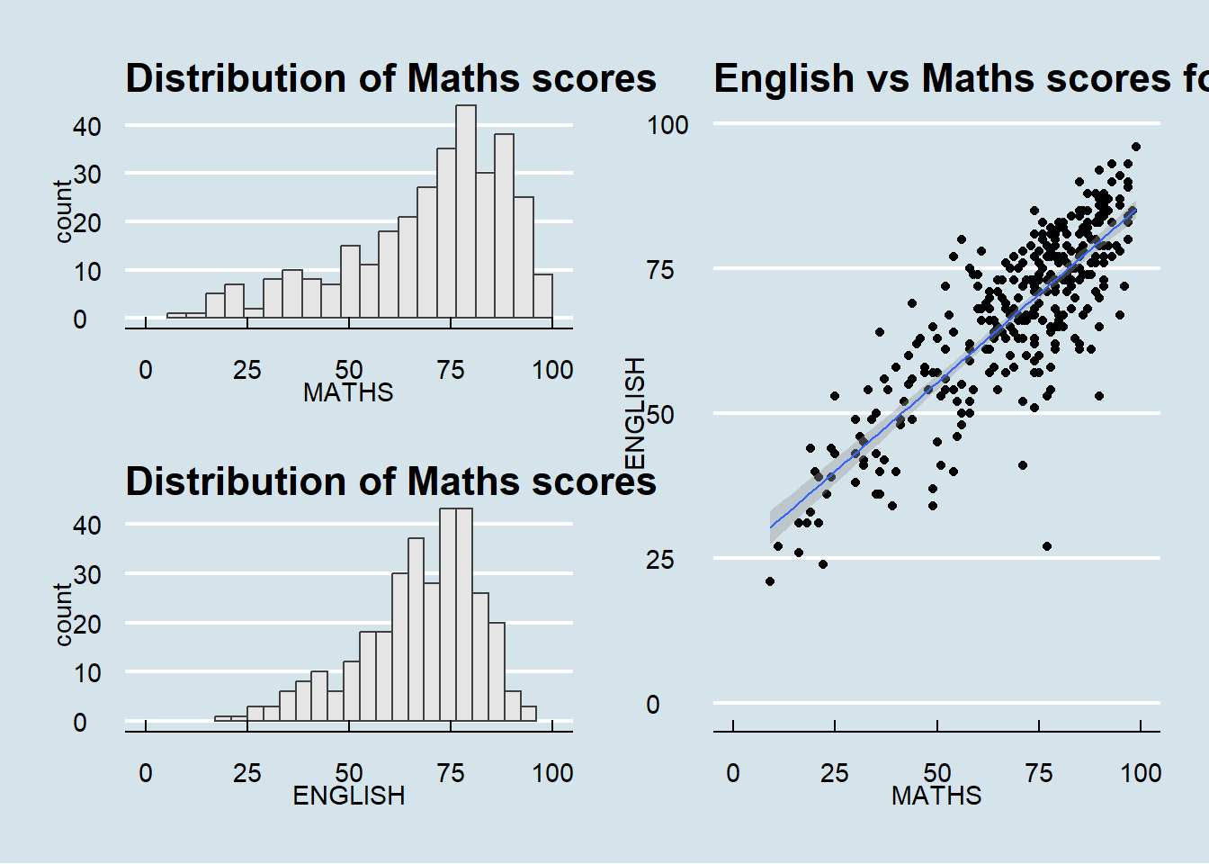 Figure in the tabset below shows a composite of two histograms created using patchwork. Note how simple the syntax used to create the plot!