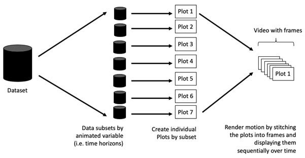 When creating animations, the plot does not actually move. Instead, many individual plots are built and then stitched together as movie frames, just like an old-school flip book or cartoon. Each frame is a different plot when conveying motion, which is built using some relevant subset of the aggregate data. The subset drives the flow of the animation when stitched back together.