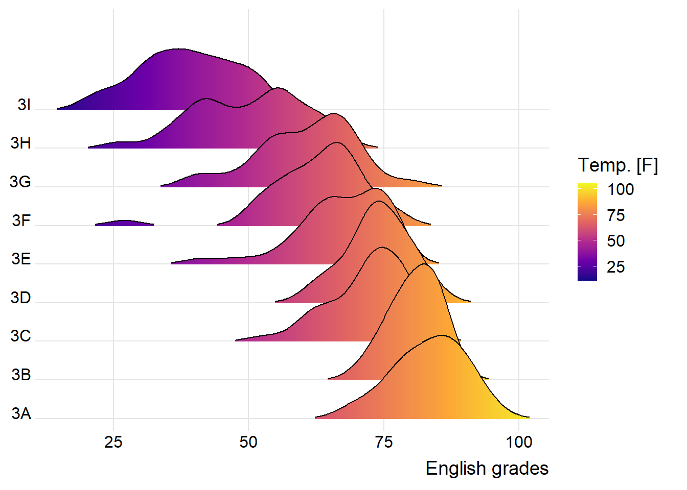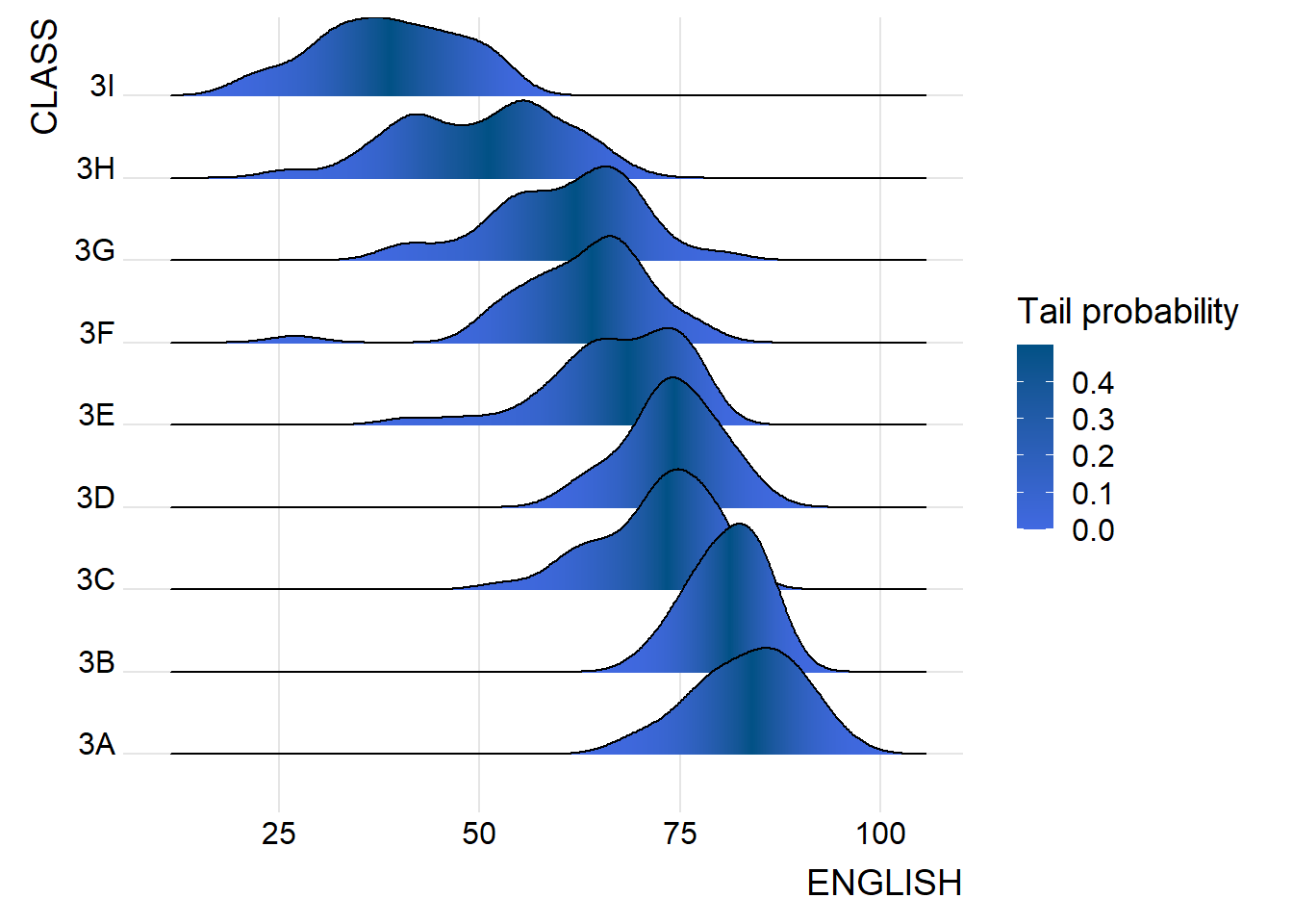 By using geom_density_ridges_gradient(), we can colour the ridgeline plot by quantile, via the calculated stat(quantile) aesthetic as shown in the figure below.