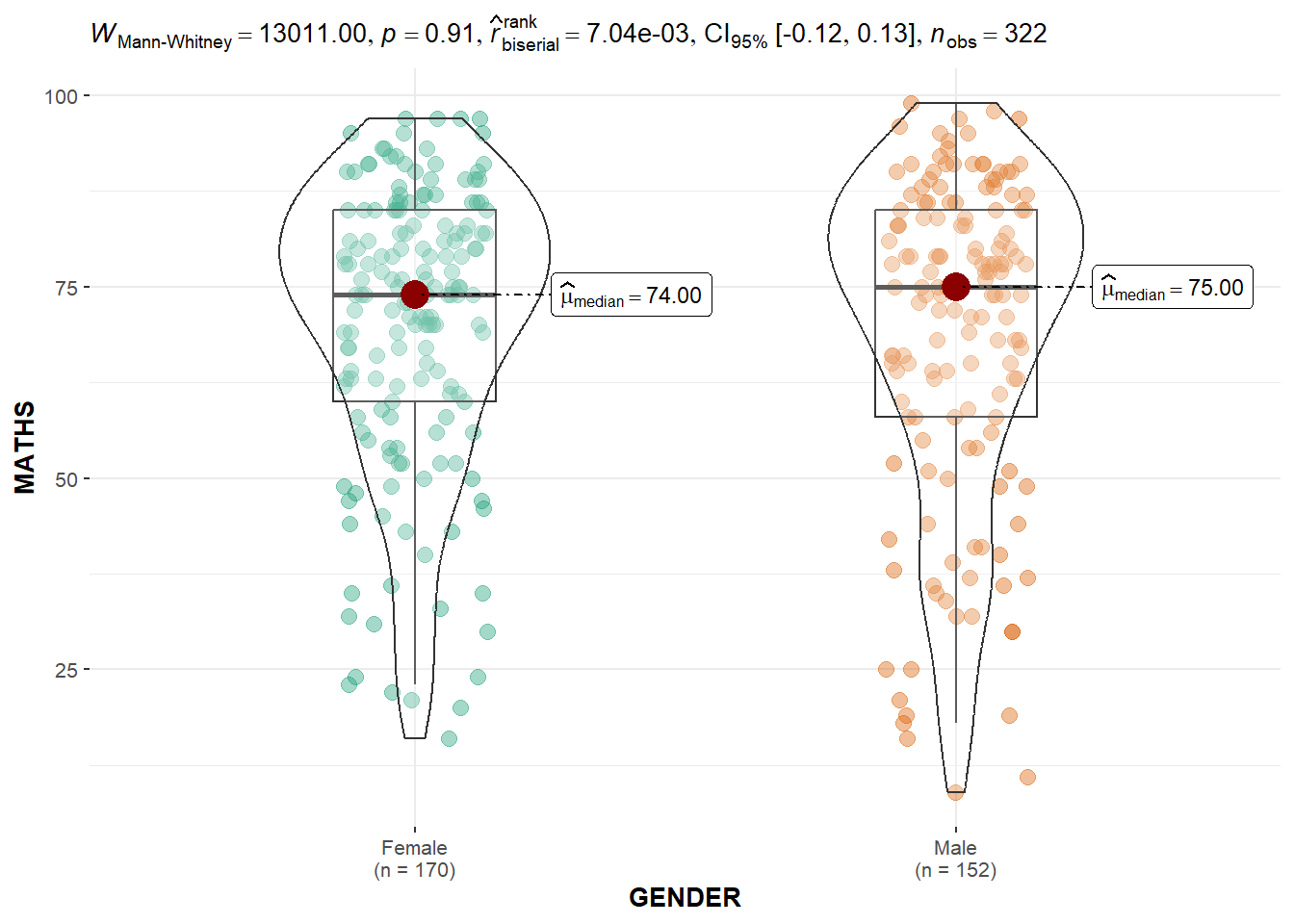 In the code chunk below, ggbetweenstats() is used to build a visual for two-sample mean test of Maths scores by gender.