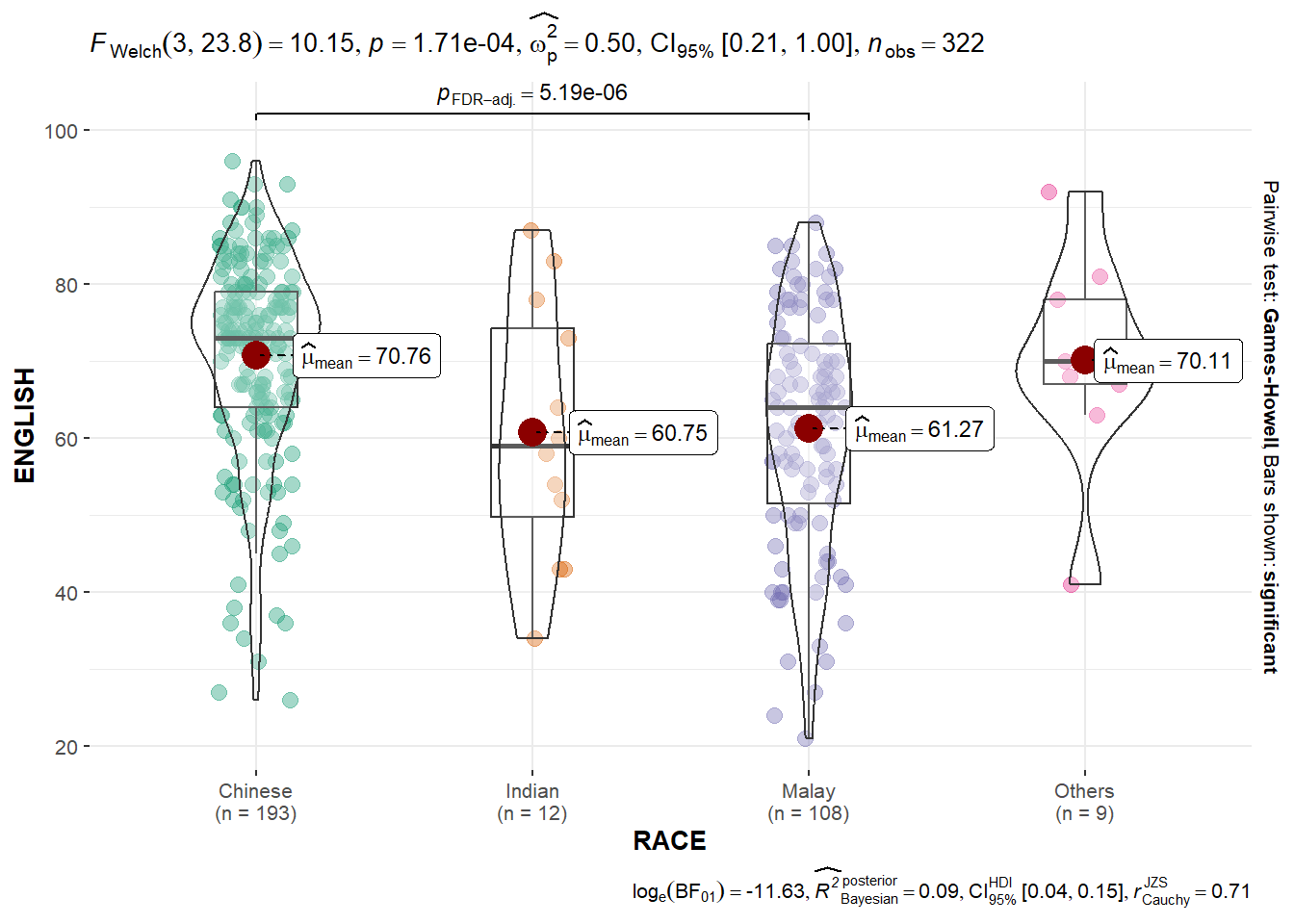 In the code chunk below, ggbetweenstats() is used to build a visual for One-way ANOVA test on English score by race.
