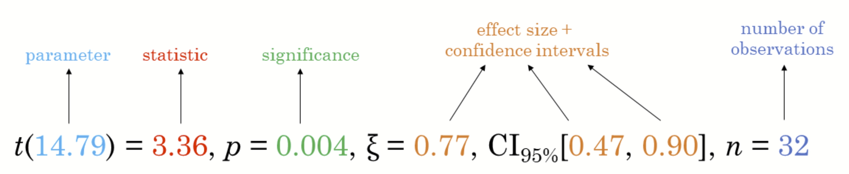 - To follow best practices for statistical reporting. For all statistical tests reported in the plots, the default template abides by the APA gold standard for statistical reporting. For example, here are results from a robust t-test:
