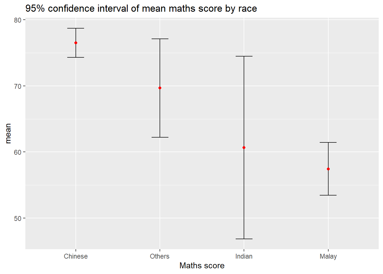 title = "95% confidence interval of mean maths score by race")- The confidence intervals are computed by using the formula mean+/-1.96*se.