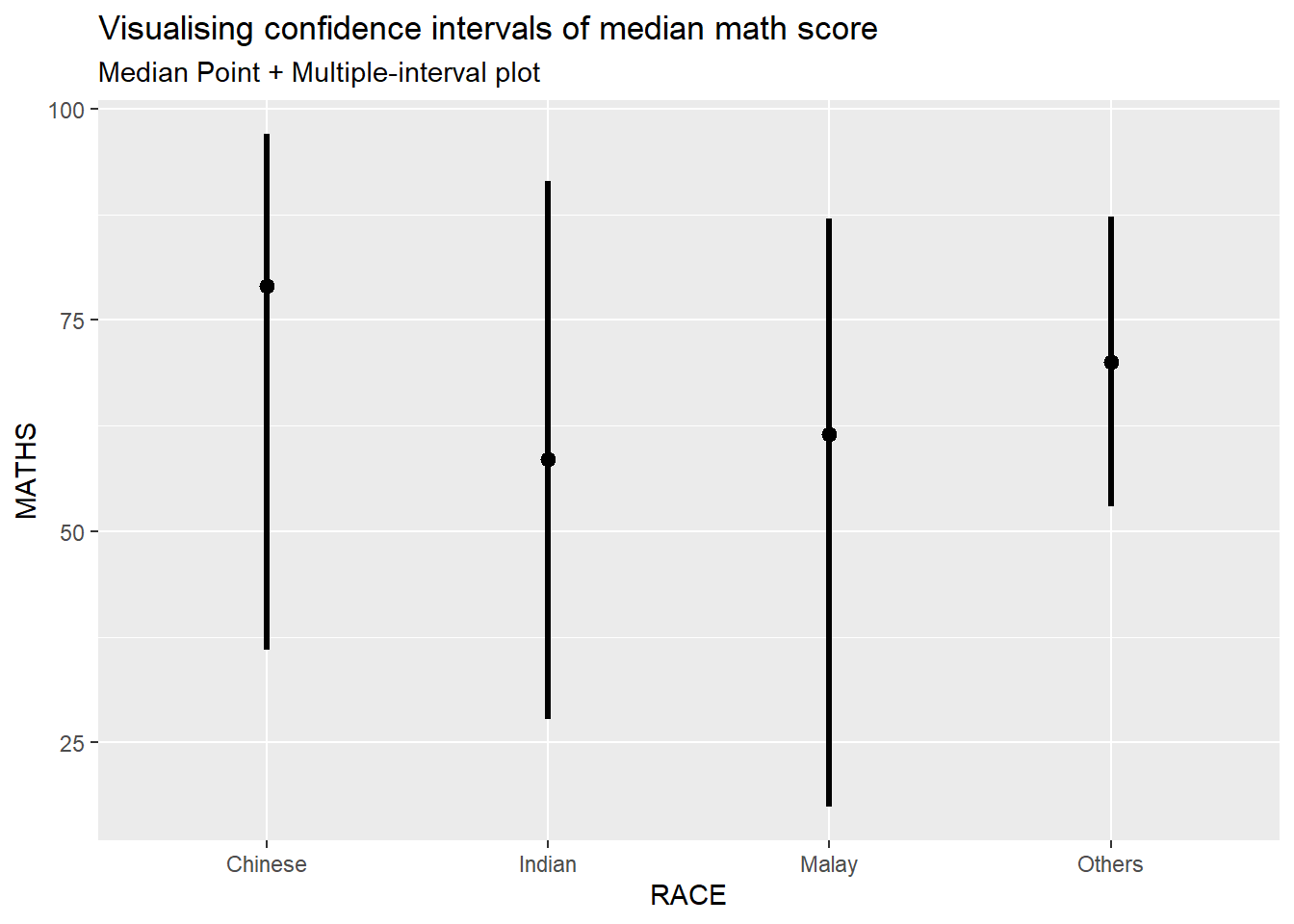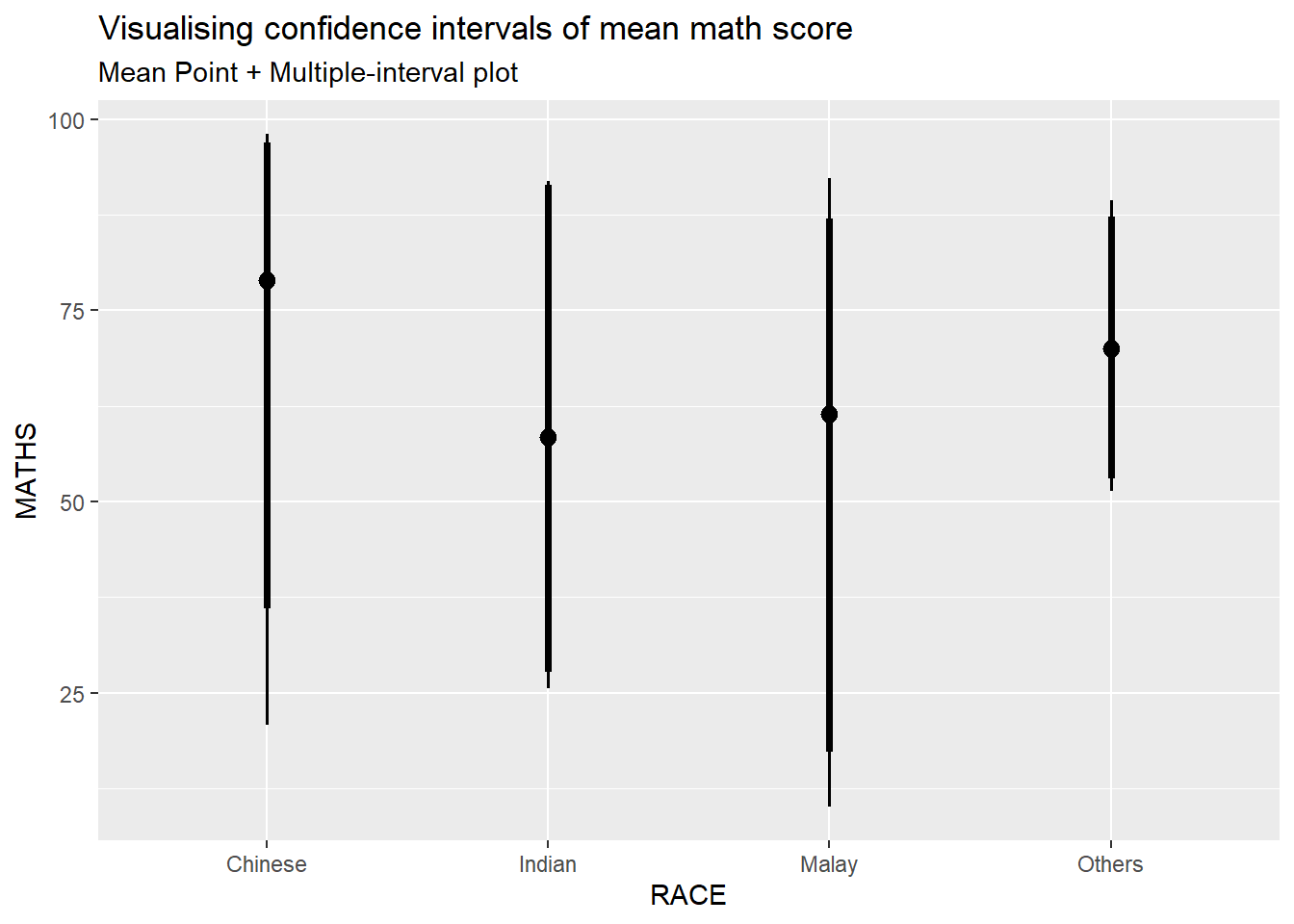 In this section, we will learn how to plot error bars of maths scores by race by using data provided in exam tibble data frame.