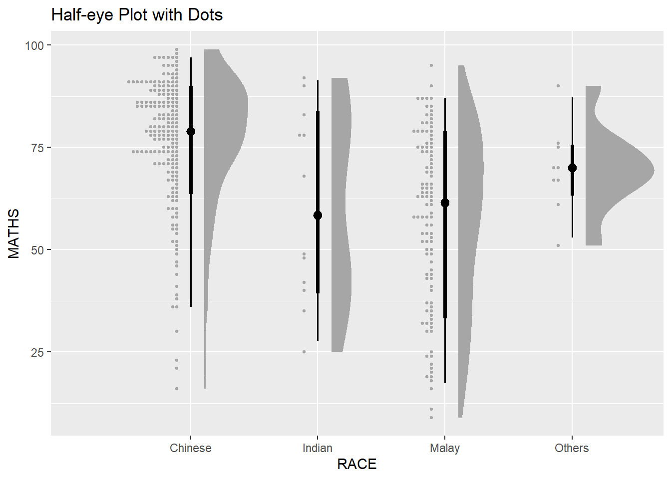 In the code chunk below, stat_gradientinterval() of ggdist is used to build a visual for displaying distribution of maths scores by race.