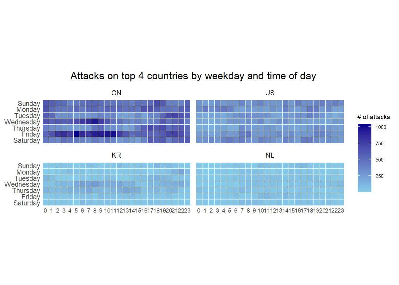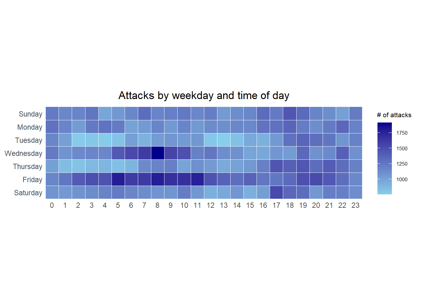 title = "Attacks by weekday and time of day") +