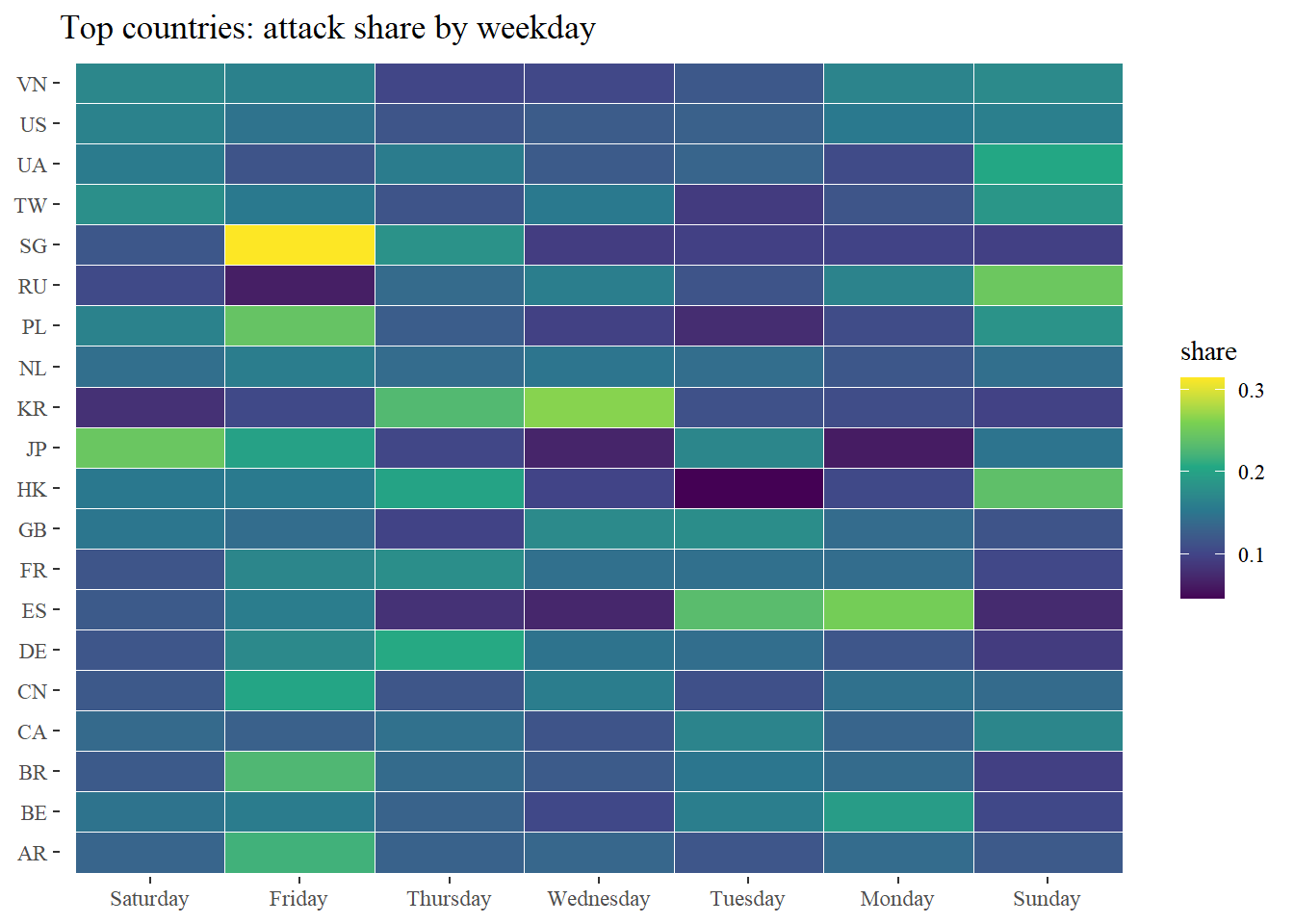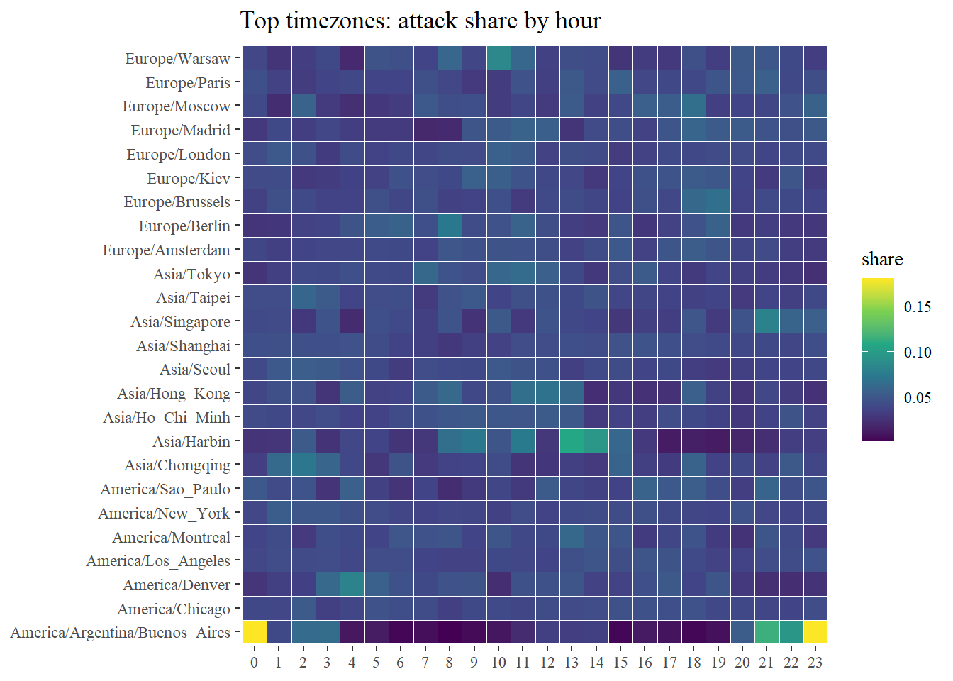 labs(x=NULL, y=NULL, title="Top timezones: attack share by hour") +