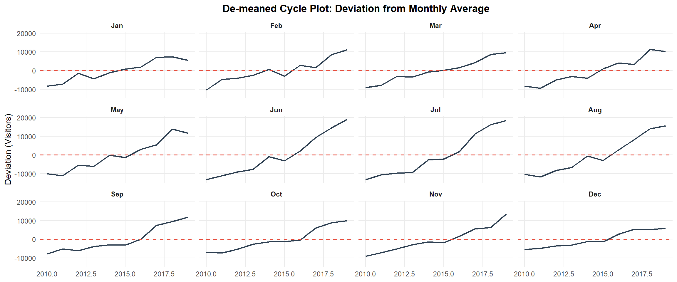 panel.grid.major = element_line(colour = "gray90", size = 0.2))This version removes the monthly average (de-meaning) so the y-axis represents deviation from the typical level of that month. It highlights unusually high/low years within each month and improves comparability across months by focusing on relative departures instead of absolute volume.