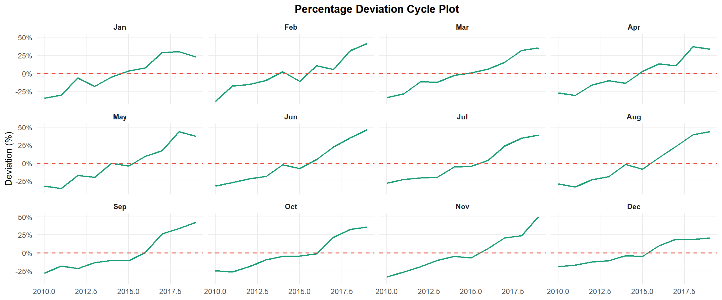 )This plot expresses deviations as percentages: (value − average) / average. Compared with absolute deviation, percentage deviation avoids scale effects (peak months naturally have larger absolute swings), making volatility more comparable across low- and high-volume months.