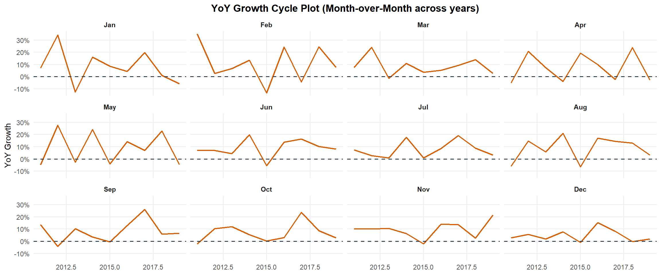 labs(title = "YoY Growth Cycle Plot (Month-over-Month across years)",