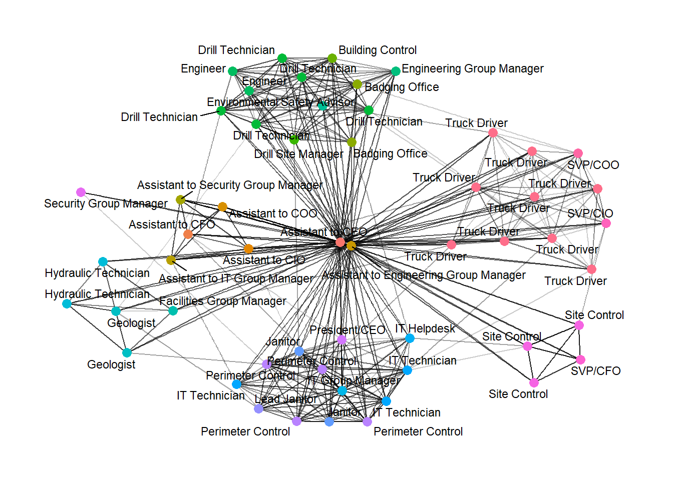 rename(group = Department) When we rerun the code chunk below, visNetwork shades the nodes by assigning unique colour to each category in the group field.