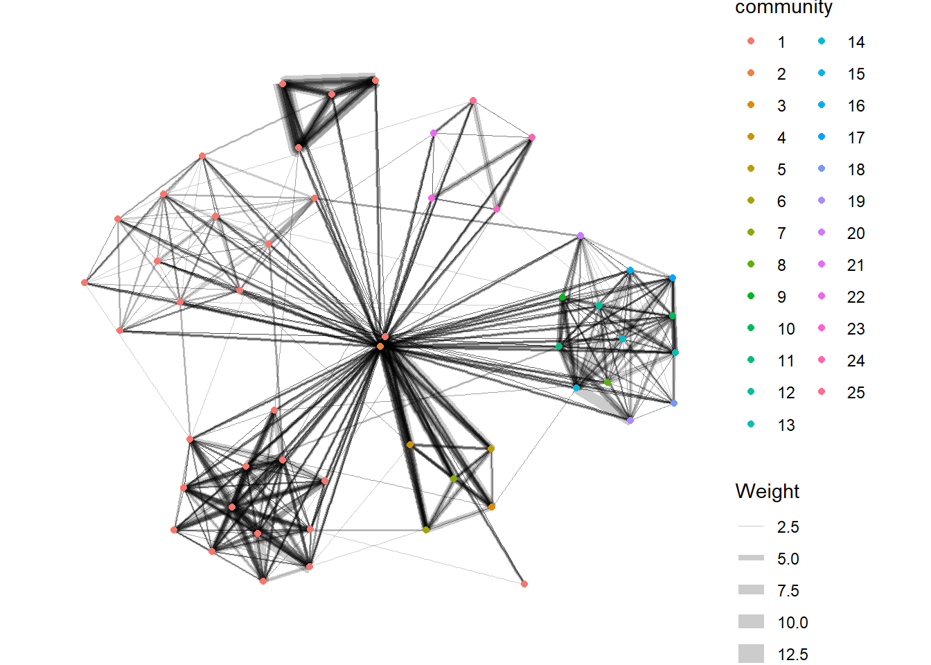 In order to support effective visual investigation, the community network above has been revised by using geom_mark_hull() of ggforce package.