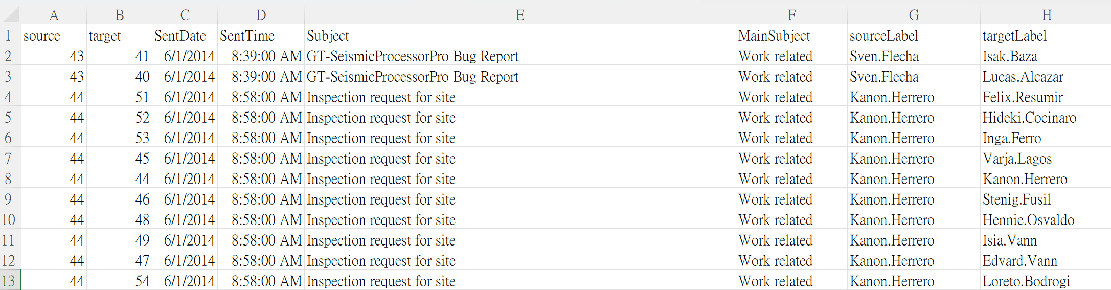 GAStech-email_edges.csv which consists of two weeks of 9063 emails correspondances between 55 employees.