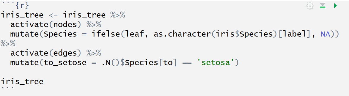 activate()verb from tidygraph serves as a switch between tibbles for nodes and edges. All dplyr verbs applied to tbl_graph object are applied to the active tibble.In the above the .N() function is used to gain access to the node data while manipulating the edge data. Similarly .E() will give you the edge data and .G() will give you the tbl_graph object itself.